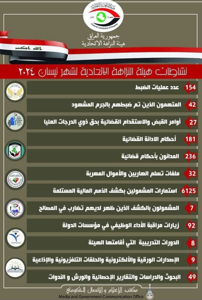 اعلنت هيئة النزاهة، اليوم الاحد، عن مجمل نشاطاتها خلال شهر نيسان الماضي، فيما أكدت اصدار 27 أمر قبض واستقدام بحق ذوي الدرجات العليا.